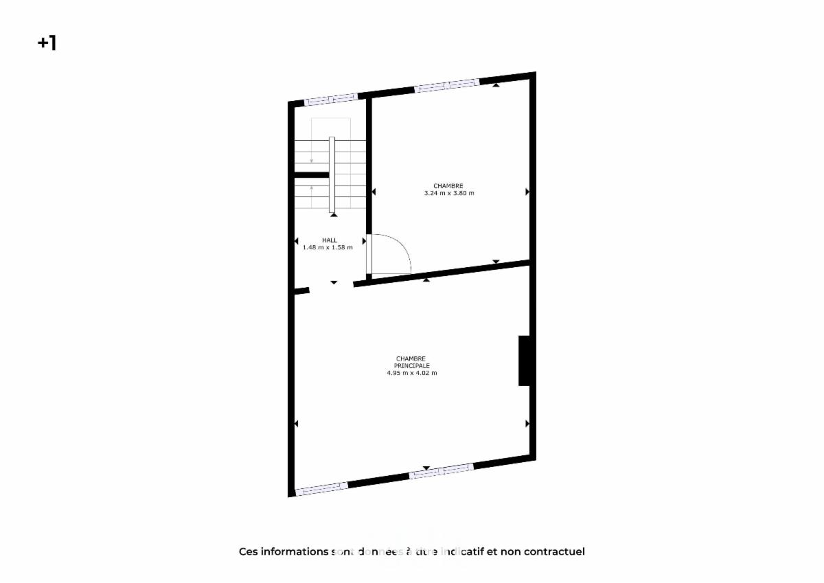 1er étage : 2 chambres spacieuses (env. 12 m² et 20 m²).